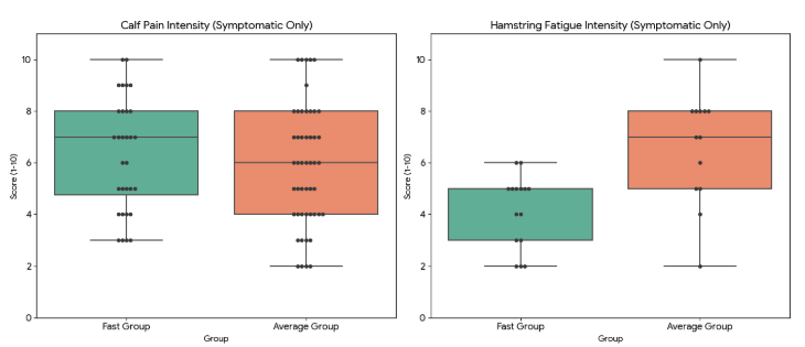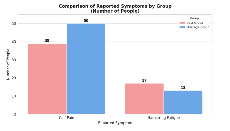 - ハムストリングスの疲労: 速い群において圧倒的に高い有意差が認められた(p < 0.01)。標準群の自覚率3.9%に対し、速い群は36.0%に達し、速度向上に伴う明確な動員パターンの差異が確認された。